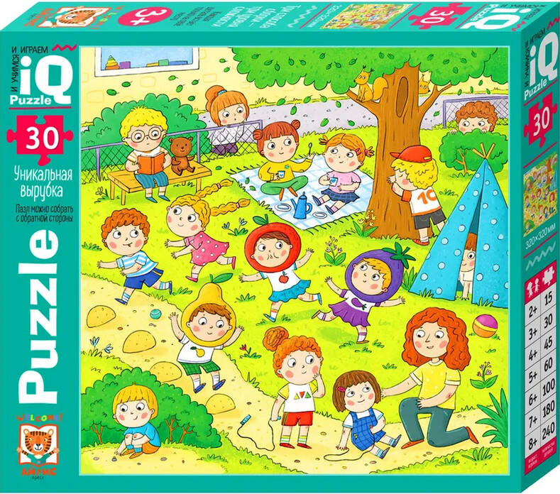 Пазл с изображением играющих детей состоит из 30 элементов. Размер картинки 32х32 см. Материал идеально подходит для детских ручек. Большие детали выполнены из плотного толстого картона. Благодаря этому они ровно лежат, замки легко соединяются и хорошо держатся. По тактильным ощущениям малыш сразу понимает, правильно ли он собрал пазл.
