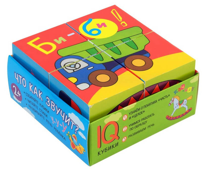 Набор состоит из 4 кубиков размером 4х4 см. Ребёнку нужно сложить картинку из 4 фрагментов. В качестве подсказки даны 6 картинок с изображением предметов. Картинка кладётся на дно коробочки, и ребёнок ставит на неё нужные кубики. На обратной стороне картинок даны стихи на звукоподражание. Повторение звуков предметов спсобствует развитию речи ребёнка. Во время игры происходит знакомство с понятиями "часть" и "целое", развивается умение работать по образцу. Наклейки на кубики сделаны из качественной гладкой бумаги, которая не портится от игры.