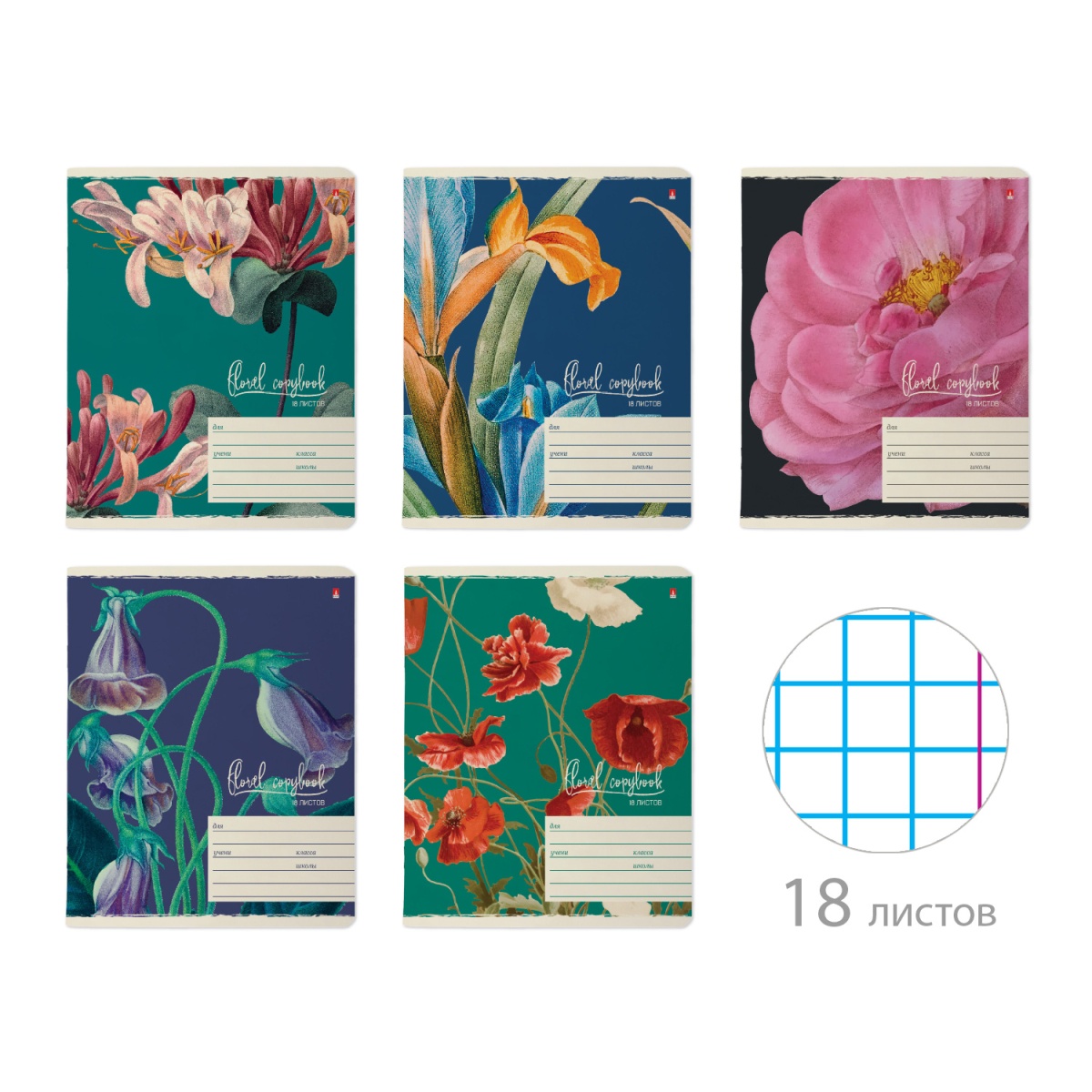 Красота цветочного орнамента получила пять разноплановых воплощений на полноцветных обложках, напоминающих акварельные рисунки. На внешней стороне обложки находится поле для персональных данных школьника. Блок фиксируется скрепками. В качестве бумаги используется высококачественный офсет плотностью не меньше 60 грамм. Блок содержит 18 листов в клетку. Линовка и поля совпадают с лицевой и оборотной сторонами листа. Поля размечены красным цветом. Скругленная форма уголков обложки снижает риск залома. Для ребенка такие яркие канцтовары станут дополнительной мотивацией прилежно учиться.