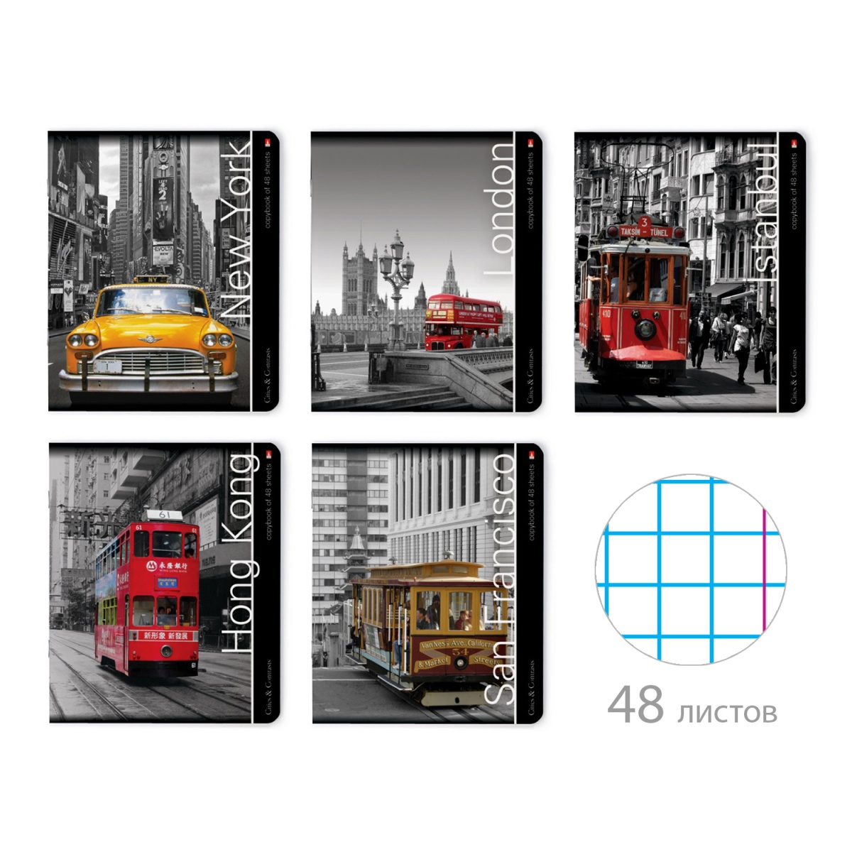 Общие тетради формата А5 серии «ГОРОДА. КОНТРАСТЫ» для учебных конспектов и рабочих записей. Износоустойчивая обложка изготовлена из мелованного картона высшего качества, плотностью 190 г/кв.м. Внутренний блок произведен из бумаги плотностью 60 г/кв.м высшего качества, соответствующей принятым ГОСТам. Линовка блока - клетка с полями - с высокой точностью совпадает на лицевой и оборотной сторонах листа. Крепление обложки и блока произведено двумя металлическими скрепками. Углы тетради скруглены.