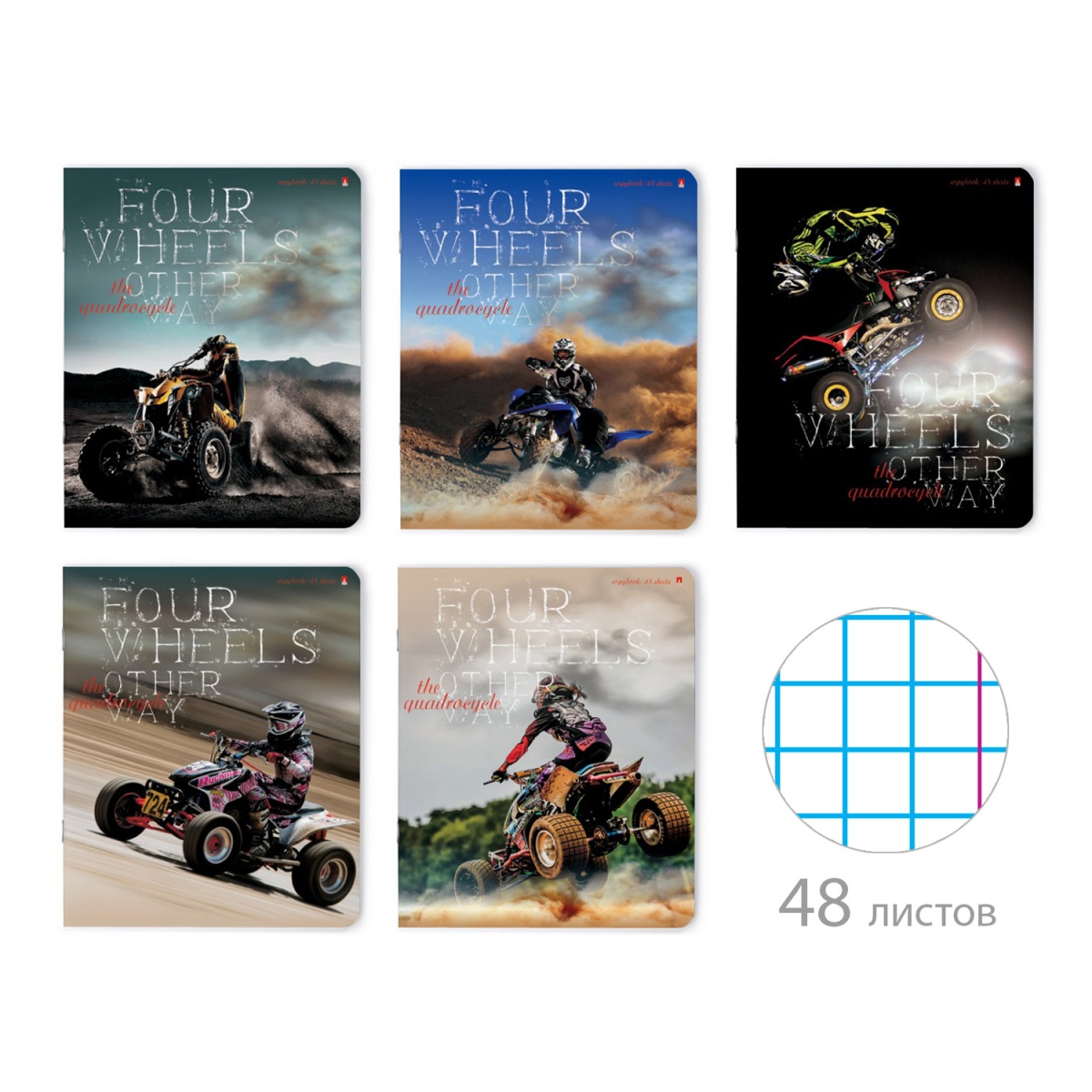 Серия общих тетрадей формата А5 объемом 48 листов «КВАДРОЦИКЛЫ. ЭКСТРИМ» для учебных конспектов и ведения рабочих записей. Обложка изготовлена из мелованного картона плотностью 190 г/м2 с дополнительным покрытием УФ-лака.