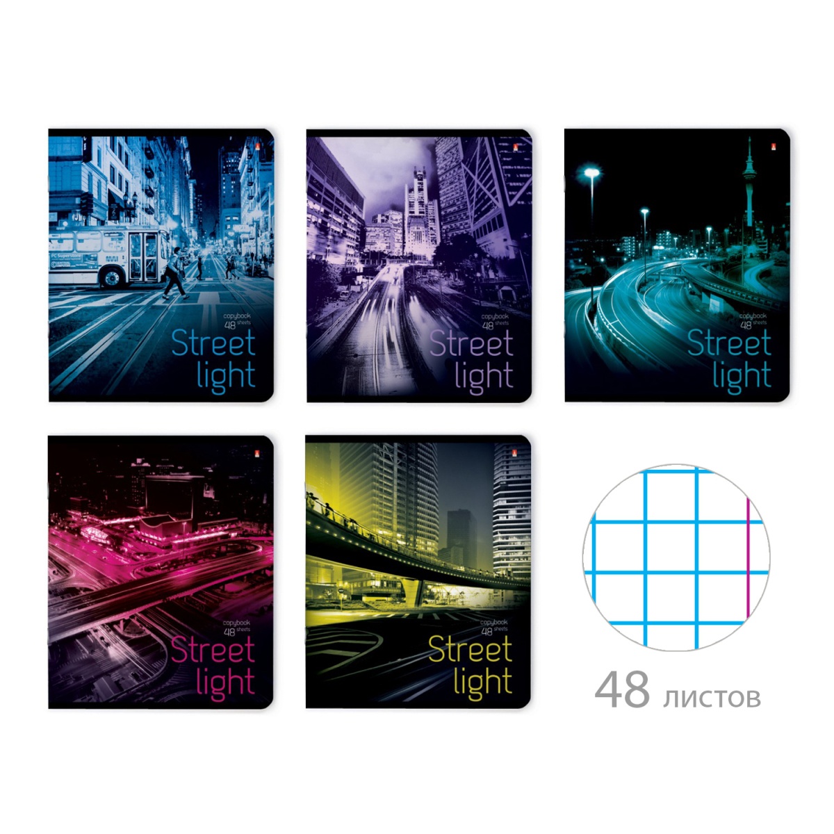 Серия общих тетрадей формата А5 на 48 листов в клетку "РИТМ МЕГАПОЛИСА". На обложке изображены фотографии улиц мегаполиса в ночном освещении в пяти неоновых тонах: синий, бирюзовый, желтый, сиреневый и красный. Дизайн тетради напомнит об энергии ночной жизни большого города. Плотная обложка выполнена из мелованного картона 190 г/кв.м со специальным лаковым покрытием, которое защищает от влаги и быстрого износа. Бумажный блок плотностью 65 г/кв.м состоит из листов белой бумаги в клетку с красными полями. Предназначена для учебных конспектов, рабочих записей.