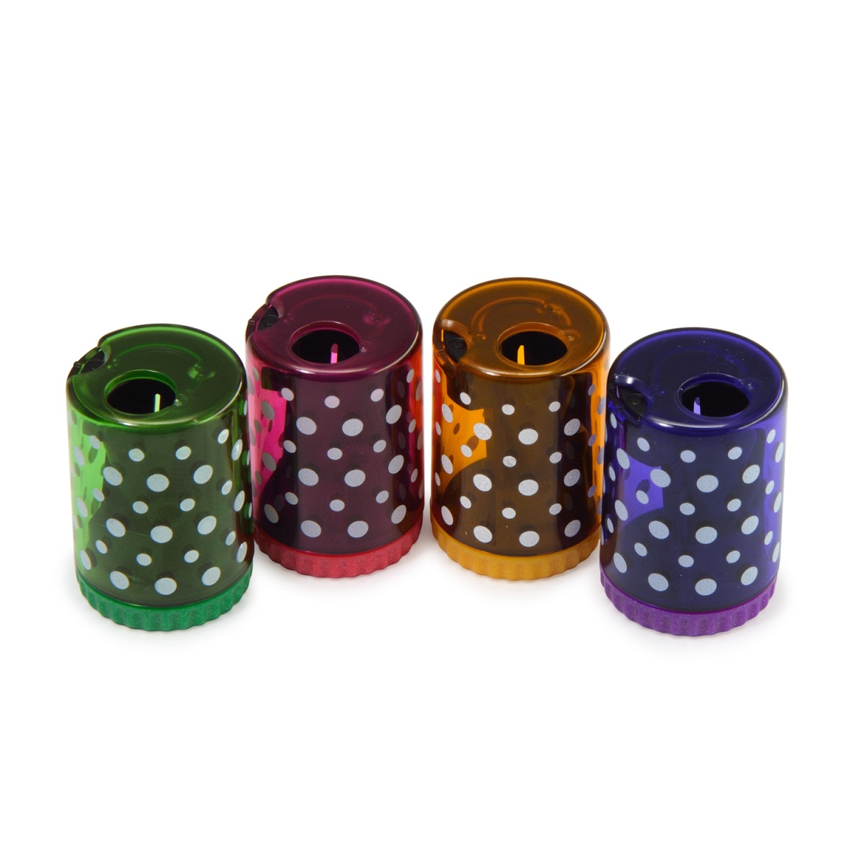 Точилка-бочонок с контейнером для сбора стружки из коллекции "EasySharp". Подходит для заточки карандашей стандартной толщины. Компактная и качественная, выполнена из полупрозрачного пластика, что позволяет вовремя заметить уровень заполнения контейнера. Представлена в четырех разных цветах: синий, желтый, розовый и зеленый. Украшена принтом в горошек. В стандартной упаковке 24 точилки.