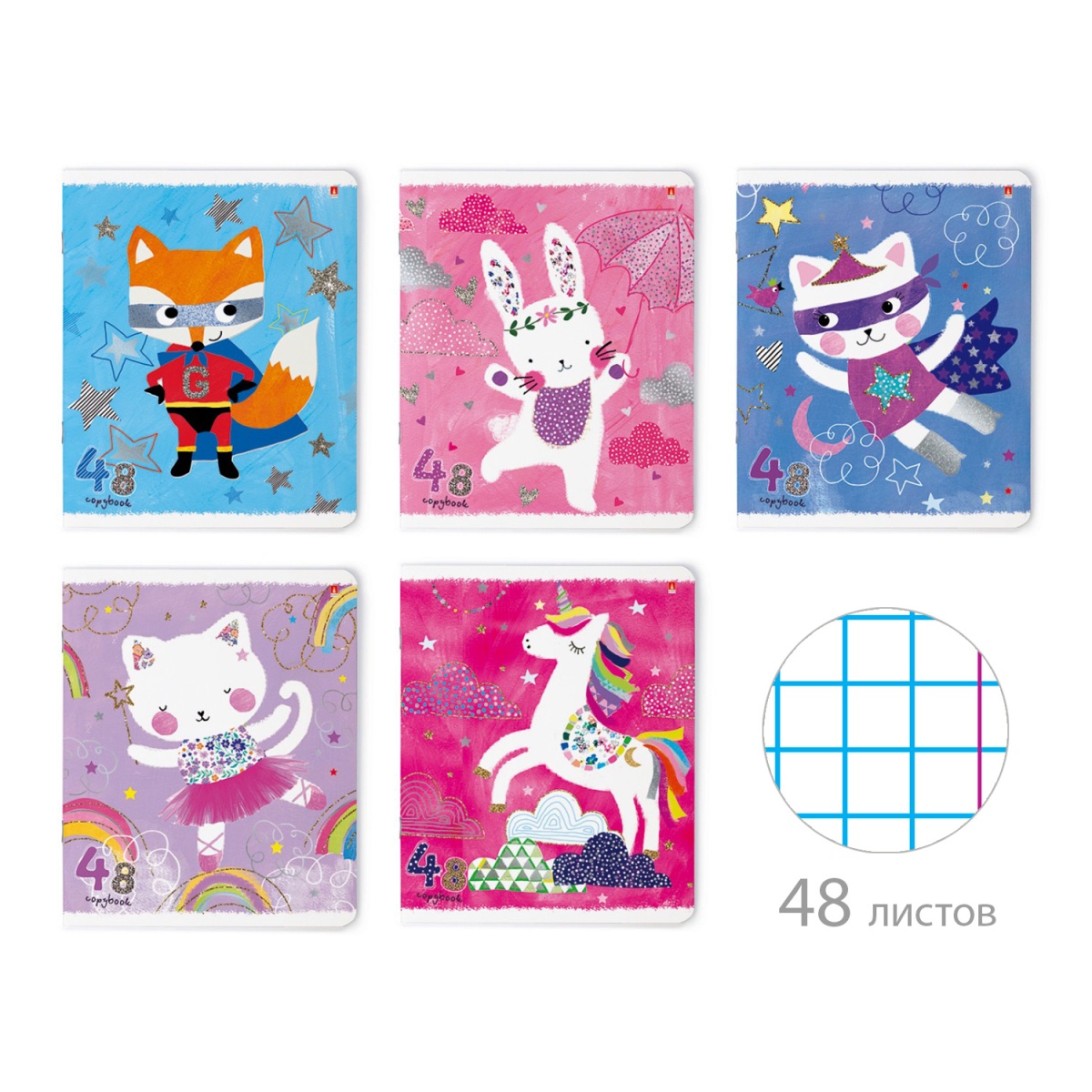 Дизайн тетрадей серии "ЯРКОЕ НАСТРОЕНИЕ" украсили мультяшные супергерои и пушистые друзья, которые привлекут внимание жизнерадостных и позитивных учеников и учениц. Тетради станут прекрасным материалом для ведения учебных записей. Благодаря высококачественным материалам их использование станет приятным и комфортным. Обложка изготовлена из мелованного картона плотностью 190 г/кв.м. Отделка обложки матовой пленкой Soft Touch защищает от воздействия влаги и делает поверхность бархатистой. Тиснение серебряной фольгой элегантно подчеркивает отдельные элементы дизайна. Блок отпечатан на белой офсетной бумаге плотностью 60 г/кв.м и 100%-й белизны, что позволяет использовать различные ручки, карандаши или фломастеры. Линовка блока - клетка с полями. Тетрадь скреплена металлическими скобами, которые надежно удерживают все листы блока. Углы тетрадей скруглены.