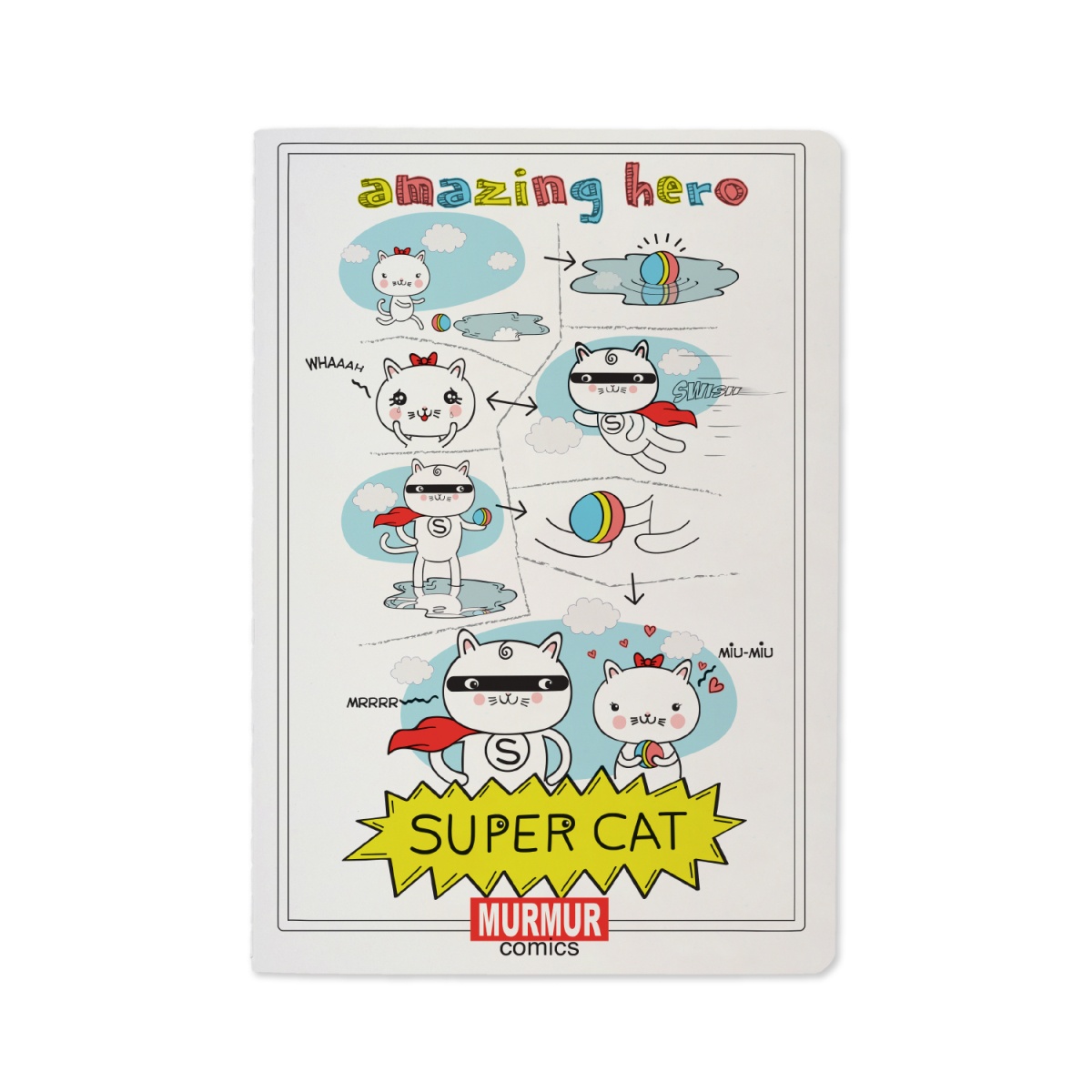 Для любителей жанра рисованных историй разработана серия тетрадей "MURMUR COMICS". Забавный кот-супергерой спешит на помощь миленькой кошечке, чтобы выручить в самой сложной ситуации. Тетрадь стандартного формата А5 прекрасно подойдет для ведения записей на лекциях, семинарах и дополнительных занятий студентам колледжей и ВУЗов. Высококачественные материалы и отличное полиграфическое исполнение обеспечат удобное и комфортное письмо. Обложка изготовлена из мелованного картона плотностью 190 г/кв.м и покрыта матовой пленкой SoftTouch, которая предохраняет от мелких царапин и воздействия влаги. Блок отпечатан на бежевой офсетной бумаге плотностью 70 г/кв.м, линовка блока - клетка 4,5 мм. Углы тетради скруглены. Титульный лист имеет линовку для подписи.