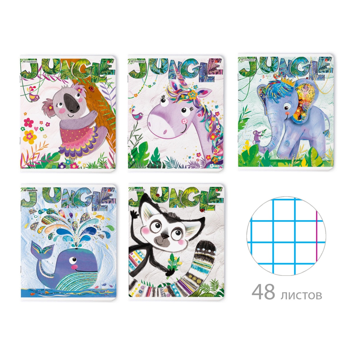 Общая тетрадь из коллекции "Праздничная карусель" объемом 48 листов. Формат А5. Дизайн выполнен в пяти вариантах в общей концепции "Jungle". На обложках нарисованы: коала, единорог, слон, кит и лемур. Обложка изготовлена из мелованного картона плотностью 190 г/кв.м. Отделка обложки - золотое фольгирование, конгревное тиснение и покрытие глянцевым и матовым лаками. Благодаря этому тетрадь яркая, красивая, защищена от влаги. Бумажный блок из белой бумаги в клетку с красными полями закреплен на скрепку. Дополнительно есть вторая иллюстрированная обложка с местом для подписи. Оптимистичные, радостные тетради подарят позитивный настрой в школьные будни. В стандартной упаковке 60 тетрадей с различным дизайном.