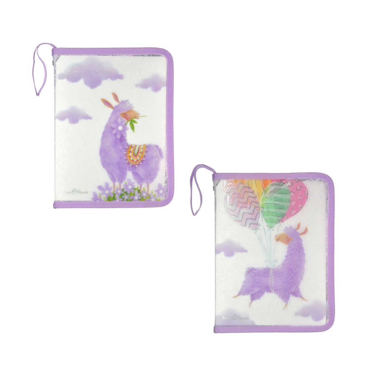 Папка формата А5 из коллекции "Лавандовая лама". Это небольшая папка на молнии с текстильной окантовкой. В нее поместятся школьные тетради, небольшие блокноты, карандаши, ластик. Папка надежно закрывается. Есть специальная петля для запястья, поэтому папку удобно нести в руке. Она изготовлена из качественного полимерного материала. Толщина пластика - 0,4 мм. Папка достаточно прочная и гибкая. Есть два варианта оформления: c ламой, пасущейся на цветочном лугу, и лама, парящая в облаках на воздушных шарах. Обе иллюстрации выполнены в нежных лавандовых оттенках. При желании можно составить комплект, дополнив другими товарами из этой серии. В стандартной упаковке 12 шт.
