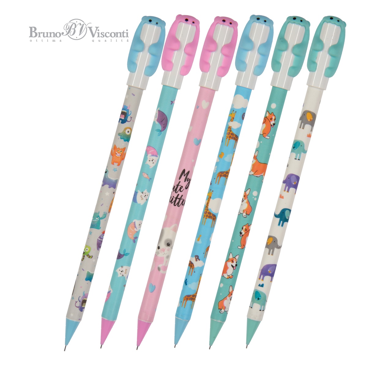Эти карандаши хочется рассматривать детально, они вызывают улыбку и поднимают настроение. Главными героями авторского дизайна от Bruno Visconti стали милые, забавные, классные зверята и монстрики. А «вишенкой на торте» служит насадка на кнопку механической подачи грифеля в виде маленького медвежонка, обнимающего карандаш.