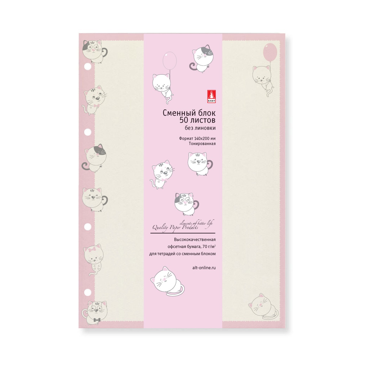 Сменный блок формата А5 без линовки. Подойдет для тетрадей с креплением на 4 кольца. Это 50 листов, обрамленных розовыми полями с рисунками котят. Бумага бежевая, повышенной плотности - 70 г/кв.м. Таким блоком можно дополнить тетрадь для зарисовок или хаотичных записей. Понравится и школьникам, и студентам. Также можно заказать дополнительные разделители блоков.