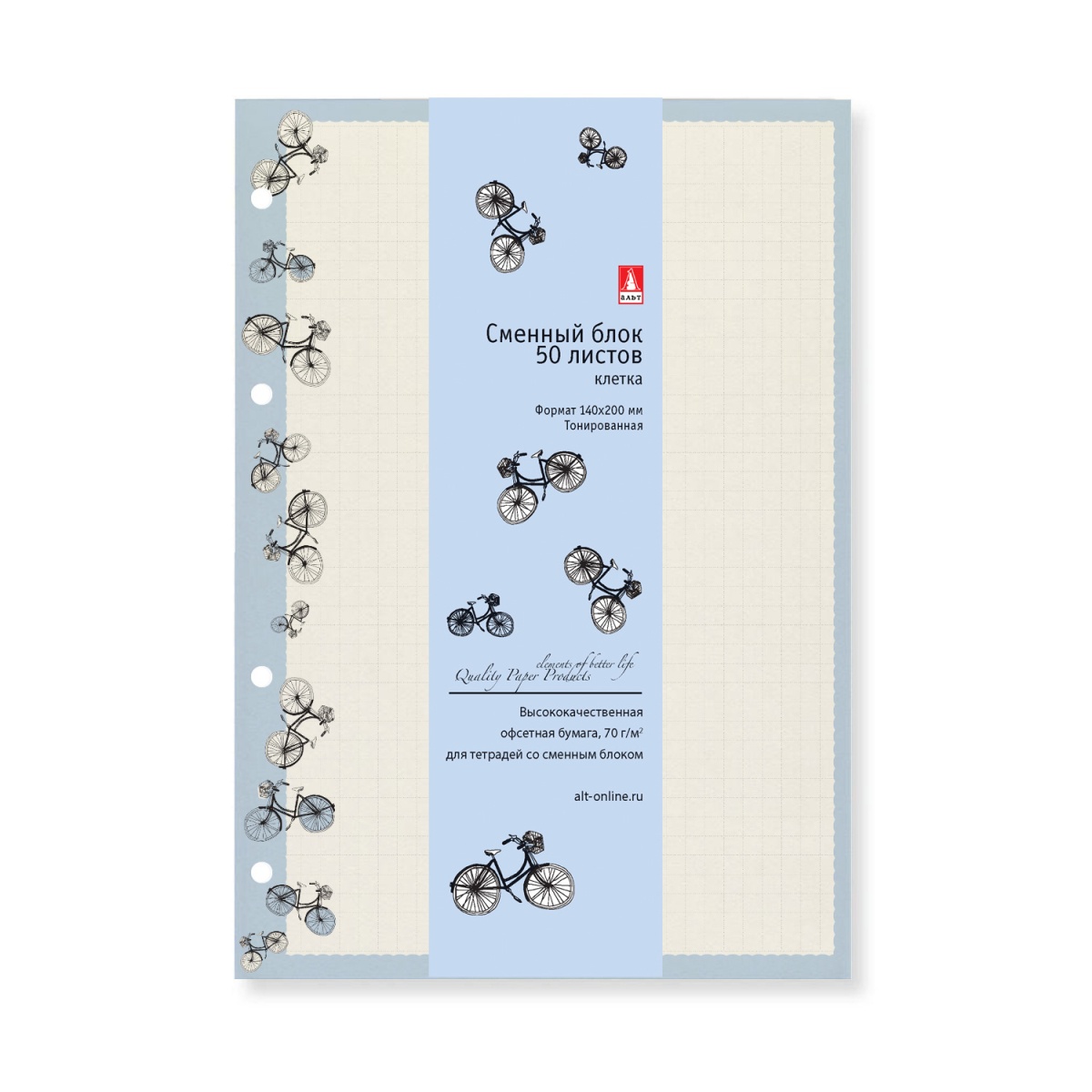 Сменный блок для тетрадей на кольцах формата А5, художественно оформленный голубыми полями с изображением велосипедов. Принт яркий и стильный. Листы блока в клетку, выполнены из бумаги повышенной плотности 70 г/кв.м бежевого цвета. Подойдет для тетрадей с креплением на 4 кольца. Удобно использовать для конспектов и лекций: легко добавить или заменить страницы. В блоке 50 листов. Дополнительно можно заказать специальные разделители для тетради.