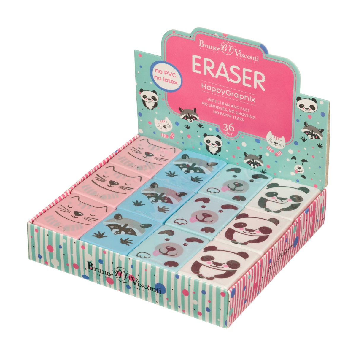Мягкие и качественные ластики из коллекции "HappyGraphix" с изображением забавных мордашек животных. Есть четыре варианта оформления: панда, собака, енот и кот. Эти компактные ластики симпатичны не только своим оформлением, но и рабочими характеристиками: стирают чисто и аккуратно, не пачкают и не портят бумагу. Сделаны из синтетического каучука. В стандартной упаковке 36 ластиков в картонном дисплее.