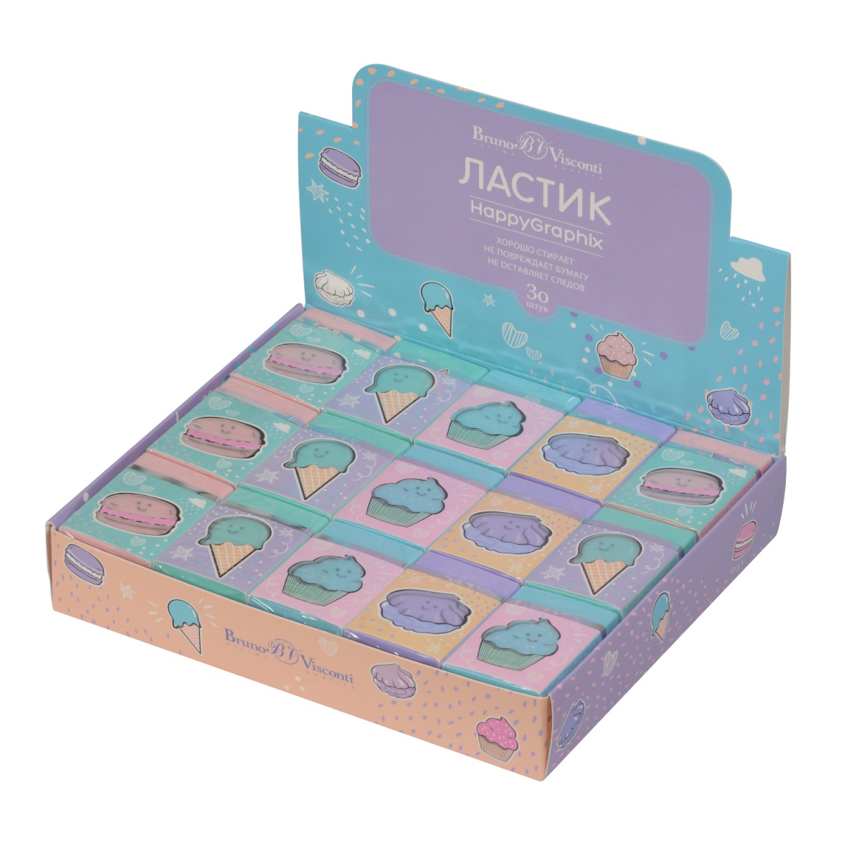 Коллекция ластиков "HappyGraphix. My sweet" в пастельных тонах. Радует приятный и нежный дизайн. На ластиках изображены: мороженое, капкейк, бургер и зефирка. Это мягкие ластики из синтетического каучука. Они чисто и аккуратно стирают излишки карандаша, не портят и не пачкают бумагу. Наверняка порадуют ваших детей любого возраста, так как ластики очень милые и стильные. Хороший выбор для использования в школе. В стандартной упаковке 30 штук в картонном дисплее.