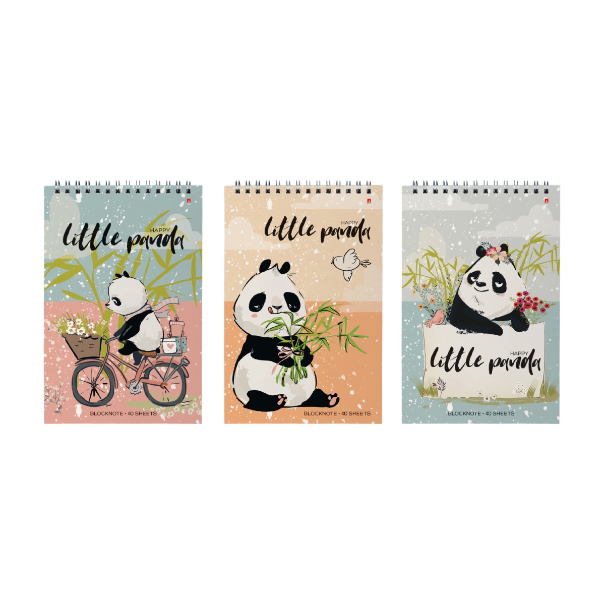 Блокнот на гребне "Удивительные панды". Дизайн передает увлечения очаровательной панды. Бумага белая плотностью 55 г, 40 листов в клетку, обложка гибкая из ламинированного картона.
