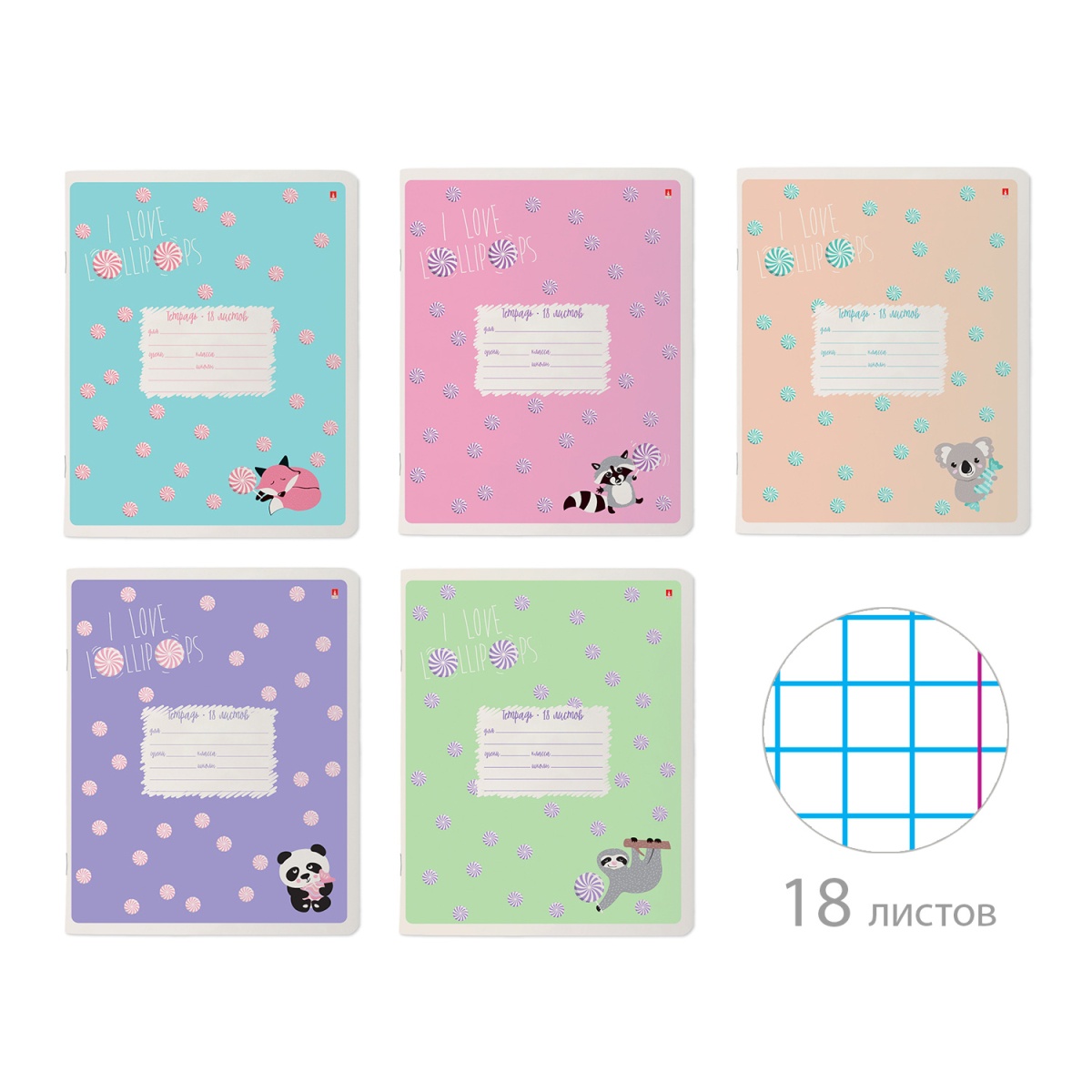 Коллекция школьных тетрадей формата А5 "Lollipop", украшенных конфетным принтом. Это качественные тетради в клетку объемом 18 листов. Обложка изготовлена из мелованной бумаги плотностью 115 г/кв.м с красочной печатью. На лицевой части обложки есть место для подписи. Бумажный блок выполнен из белой бумаги в клетку с красными полями. Есть 5 вариантов оформления тетради: голубая с лисенком, розовая с енотом, бежевая с коалой, сиреневая с пандой и зеленая с ленивцем. В упаковке 200 шт. разных цветов. При желании можно составить комплект с другими товарами из этой серии, например, с дневником и ручкой.