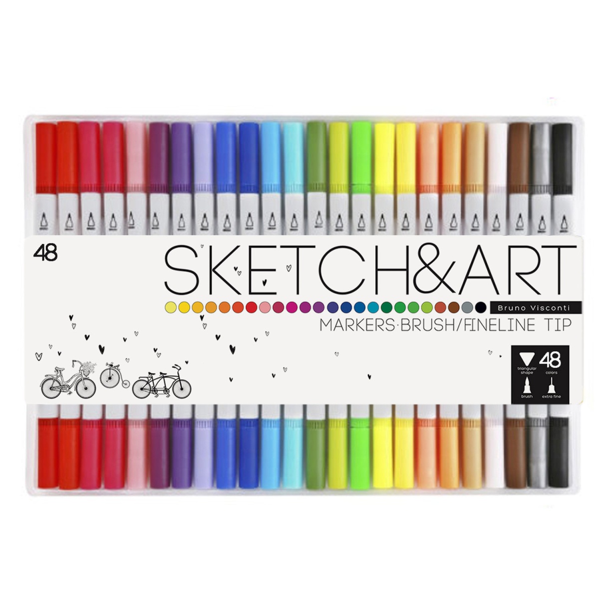 Набор двусторонних скетч-маркеров «Sketch&Art» 22-0101 – это 48 цветов и безграничные возможности для творчества, реализации идей с помощью линера и brash-кисти. Линер – универсальный для скетчинга инструмент, с помощью которого наносят контуры под маркеры или акварель, делают записи и наброски. Он дает четкий штрих и равномерную тонкую линию. Гибкий, легко принимающий прежнюю форму наконечник-кисть имеет возможность создавать линии различной ширины – от 1 до 3 мм в зависимости от угла и силы нажатия. Она идеальна для тех, кто желает преуспеть в скетчинге, леттеринге, каллиграфии. Перманентные чернила маркера на водной основе, быстросохнущие и светостойкие, что важно – нетоксичные. Эргономичный корпус трехгранной формы имеет антискользящее покрытие, а вентилируемый колпачок в цвет чернил - точечные углубления, предотвращающие скольжение пальцев рук при открывании маркера.