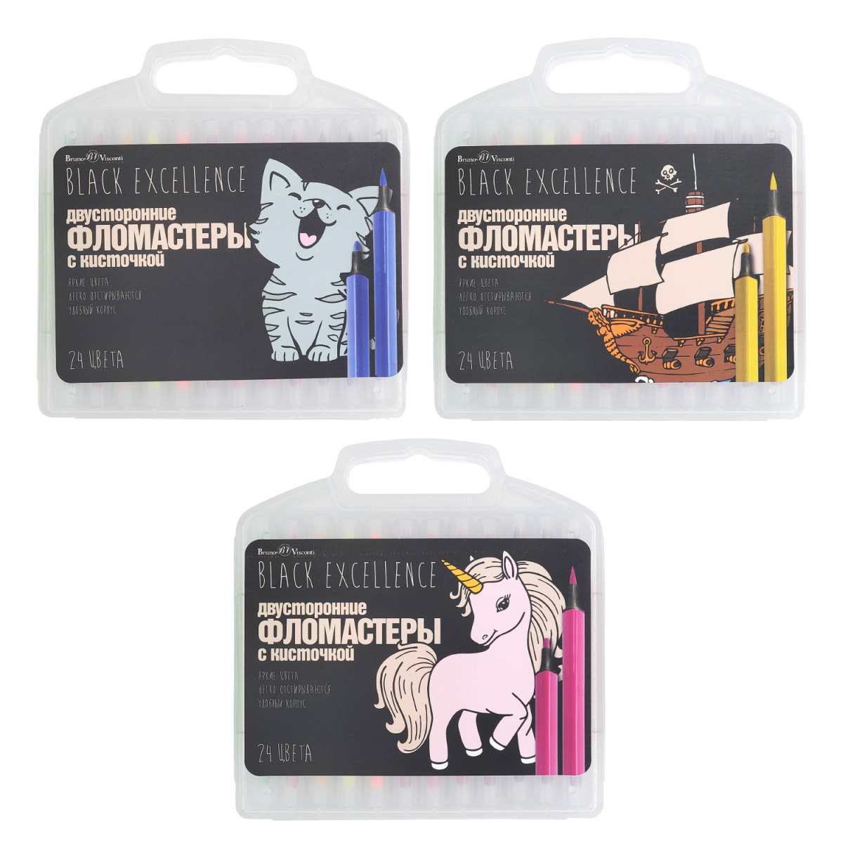 Фломастеры «BLACK EXCELLENCE» от Bruno Visconti гарантируют яркие, сочные рисунки. Ведь они обладатели чернил на водной основе с высоким содержанием цветных пигментов, абсолютно не токсичных и безопасных для ребенка.
