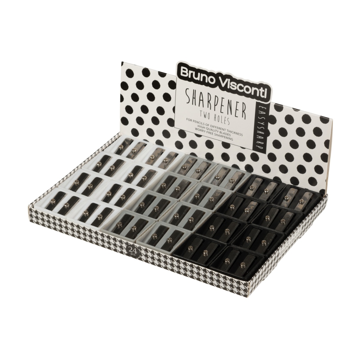 Точилка EASYSHARP.ARTGRAPHIX ТМ Bruno Visconti универсальная с двумя отверстиями. Предназначена для заточки чернографитовых и цветных карандашей разной формы и толщины. Качественную заточку гарантирует стальное лезвие. Благодаря компактному размеру не займет много места в школьном пенале. Изделие безопасно при использовании по назначению.