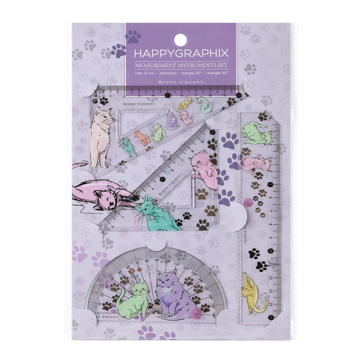 Набор измерительных инструментов из коллекции "Happy Graphix. Котики" ТМ Bruno Visconti прекрасно подойдет для использования на уроках математики в средней школе. В наборе: два треугольника на 30 и на 45 градусов, стандартная линейка с длиной разметки 15 см и транспортир. Все предметы выполнены в одном стилевом решении. Набор изготовлен из нетоксичного прозрачного пластика. Шкалы с разметками нанесены тиснением и не сотрутся. По измерительной стороне линеек есть фаски, так что их удобно прикладывать и удерживать на бумаге: линии получаются точными и четкими.