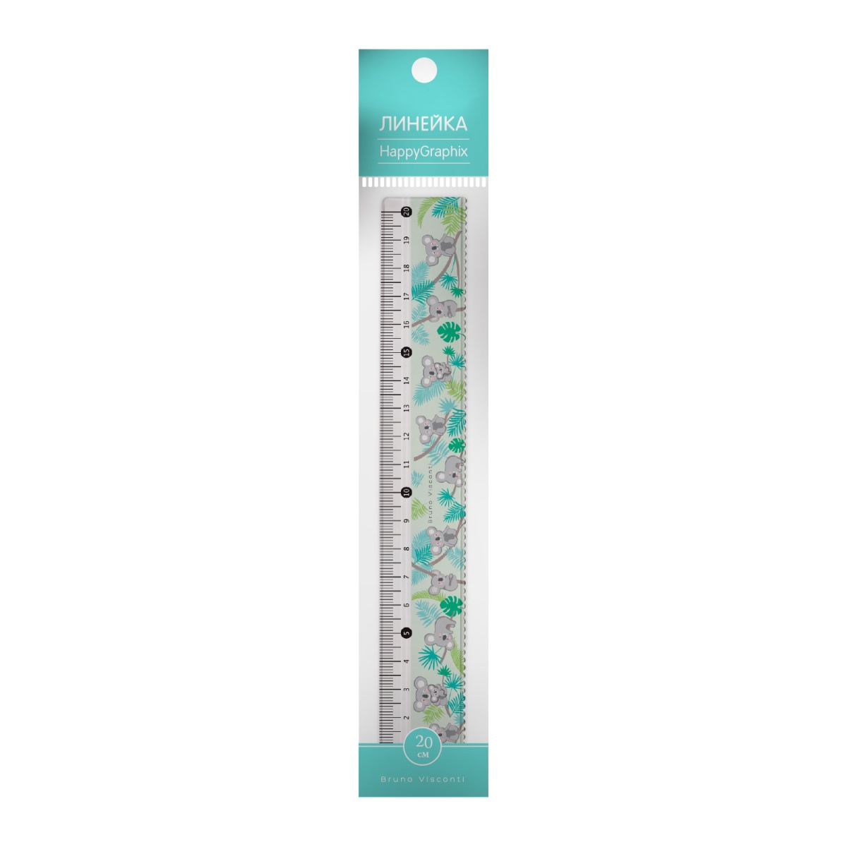 Пластиковая линейка "Happy Graphix" с волнистым краем, длиной 20 см из серии "Sweet animals" с принтом из коал и растительным орнаментом. Изготовлена из качественного нетоксичного пластика. По верхнему краю линейки расположена прозрачная шкала с разметкой и цифрами. Есть фаска, которая позволяет точно приложить линейку и прочертить четкие линии. Риски шкалы, с акцентом на каждые пять сантиметров, нанесены тиснением и не сотрутся. Нижняя сторона линейки предназначена для черчения волнистых линий. В стандартной упаковке 24 шт. в индивидуальных пакетах с европодвесом.