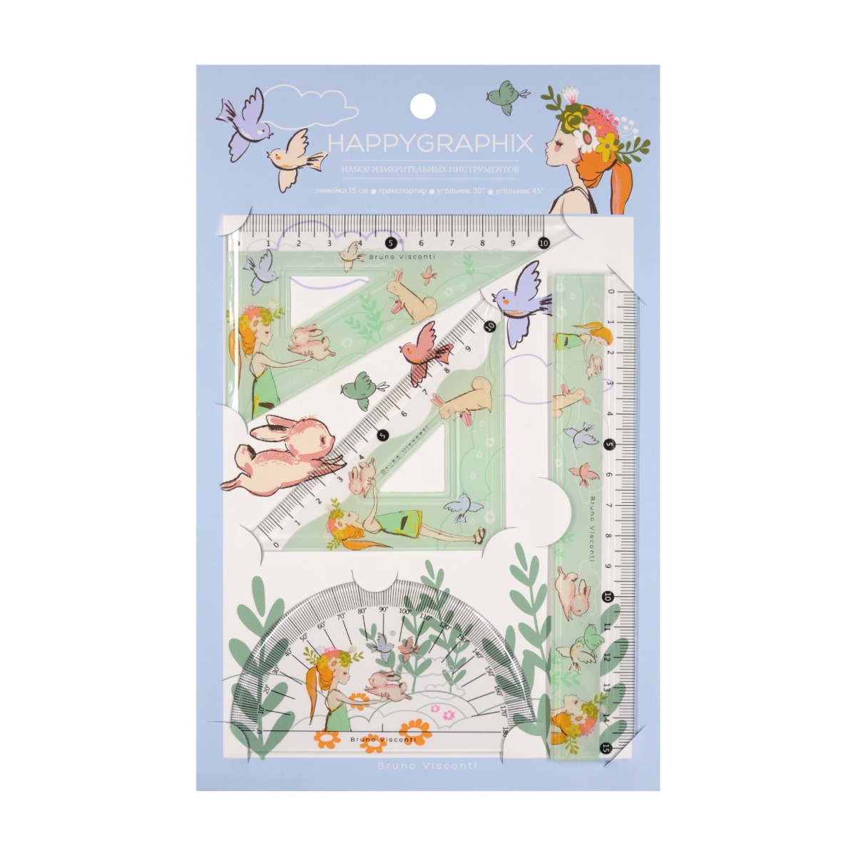 Набор измерительных инструментов из коллекции "Happy Graphix". Прекрасно подойдет для использования на уроках математики в средней школе. В наборе: два треугольника на 30 и на 45 градусов, стандартная линейка с длиной разметки 15 см и транспортир. Все предметы выполнены в одном стилевом решении. Линейки украшены картинками в мятно-бежевых тонах, на которых изображены девочка и кролики. Набор изготовлен из нетоксичного прозрачного пластика. Шкалы с разметками нанесены тиснением и не сотрутся. По измерительной стороне линеек есть фаски, так что их удобно прикладывать и удерживать на бумаге: линии получаются точными и четкими. В стандартной упаковке 24 набора в индивидуальных пакетах с европодвесом.