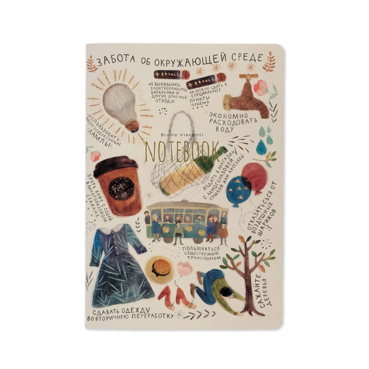 Общая тетрадь в клетку объемом 40 листов из серии "Среда обитания". Формат А5. Дизайн этой серии созвучен людям, которые заботятся об окружающей среде и готовы делиться своей жизненной позицией. Оформление обложки представляет собой памятку с иллюстрациями в стиле скетчинга, клторые напомнят о простых способах вести более экологичный образ жизни. Обложка изготовлена из мелованного картона плотностью 190 г/кв.м. Она приятна на ощупь благодаря матовому ламинированию с эффектом "Soft Touch". Внутри бумажный блок состоит из листов в клетку бежевого цвета. Они скреплены между собой декоративной нитью. Предусмотрены вторая обложка с местом для подписи и блок для заметок на последней странице. Это качественная, красивая и полезная тетрадь. В стандартной упаковке 24 шт.