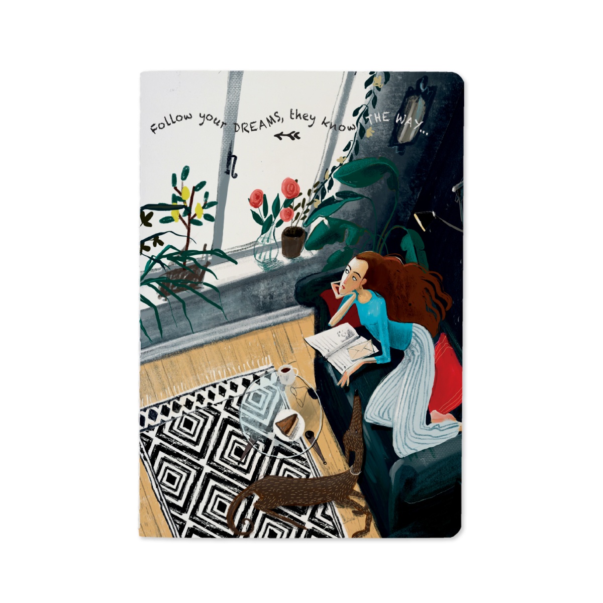 Общая тетрадь объемом 40 листов в клетку "Follow your dreams". Формат А5. На обложке - мечтающая девушка с собакой в ярком интерьере. Стильная и качественная тетрадь порадует и в школе, и в офисе, и на лекции. Обложка, приятная и мягкая на ощупь, выполнена из мелованного картона с золотым фольгированием и матовой ламинацией "Soft Touch". Бумажный блок состоит из листов бежевого цвета и скреплен декоративной нитью. Углы закругленные. В тетради предусмотрена вторая титульная обложка с ярким оформлением. На последней странице есть блок для заметок. В стандартной упаковке 24 шт.