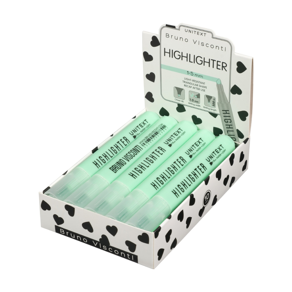 Текстовыделитель-хайлайтер мятного цвета из серии "UniText". Качественный текстовыделитель - это необходимый инструмент для работы с документами и текстами. Пигментные чернила на водной основе, которыми заполнен этот хайлайтер, дают идеальную прозрачность, яркий тон и равномерное нанесение. Маркер быстро высыхает на бумаге. Линии не расплываются. Толщина линии варьируется от 1 мм до 5 мм, благодаря клиновидному пишущему узлу. Это позволяет точно и аккуратно выделить нужный фрагмент текста. Выполнен в трехгранном полимерном корпусе из полипропилена. Удобно ложится в руку. В стандартной упаковке 10 шт. в картонной коробке.