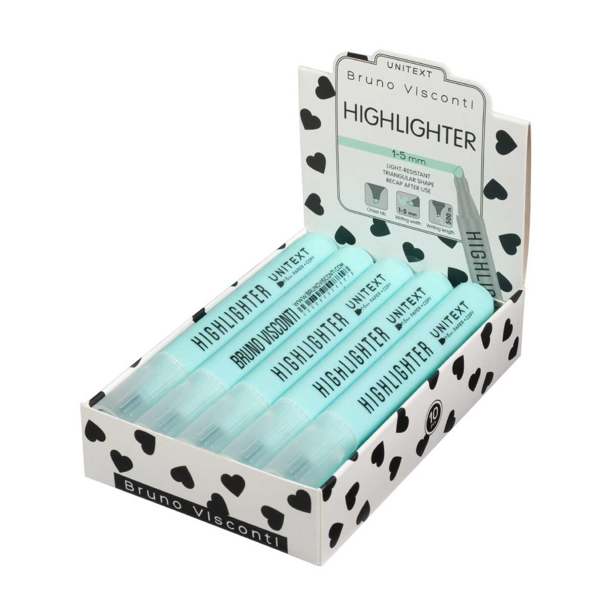 Текстовыделитель-хайлайтер нежно-бирюзового цвета из серии "UniText". Качественный текстовыделитель - это необходимый инструмент для работы с документами и текстами. Пигментные чернила на водной основе, которыми заполнен этот хайлайтер, дают идеальную прозрачность, яркий тон и равномерное нанесение. Маркер быстро высыхает на бумаге. Линии не расплываются. Толщина линии варьируется от 1 мм до 5 мм, благодаря клиновидному пишущему узлу. Это позволяет точно и аккуратно выделить нужный фрагмент текста. Выполнен в трехгранном полимерном корпусе из полипропилена. Удобно ложится в руку. В стандартной упаковке 10 шт. в картонной коробке.